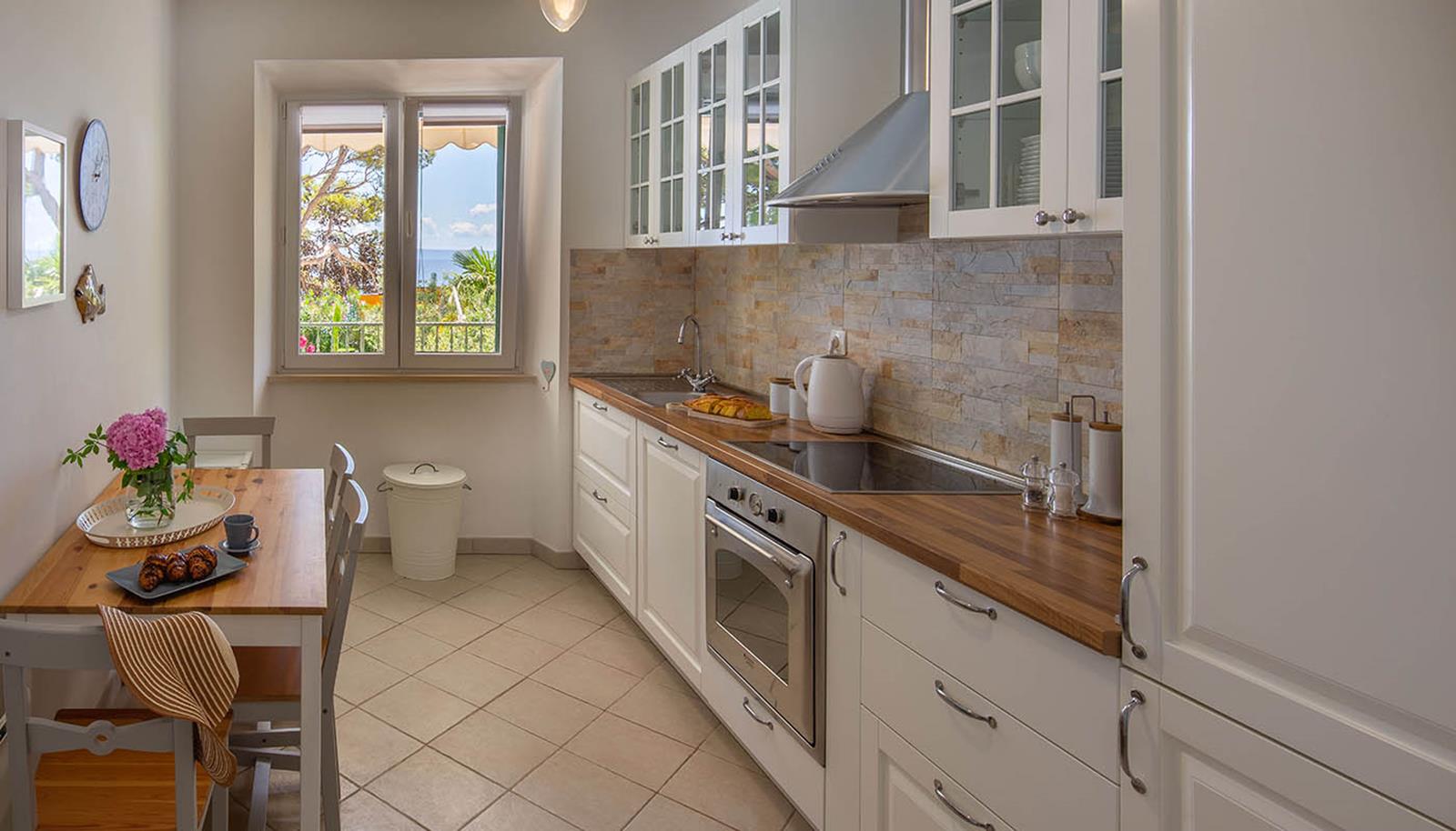 U kuhinji naći ćete sve što Vam treba za kuhanje obroka iz snova. Bogato je opremljena: perilicom za suđe, ugradbenim hladnjakom i zamrzivačem, napom, kuhalom za vodu, aparatom za kavu. Uz kuhinjuu se nalazi blagavaonica sa stolom za 8 osoba i stolicom za djete. Blagavaonica je povezana s terasom na kojoj se također nalazi stol za 8-10 osoba.