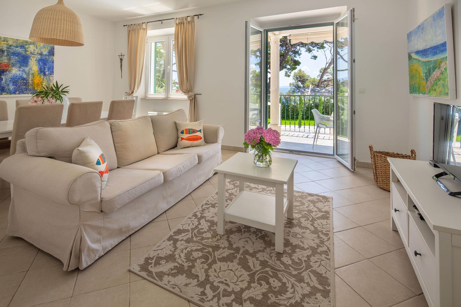U velikom dnevnom boravku nalazi se stol za 8 gostiju, lijepi kauč i SAT TV. Omogućen je i pristup na internet (Wi-Fi). Također smo mislili na Vaše dragocjenosti za koje Vam na raspolaganju stoji sef.