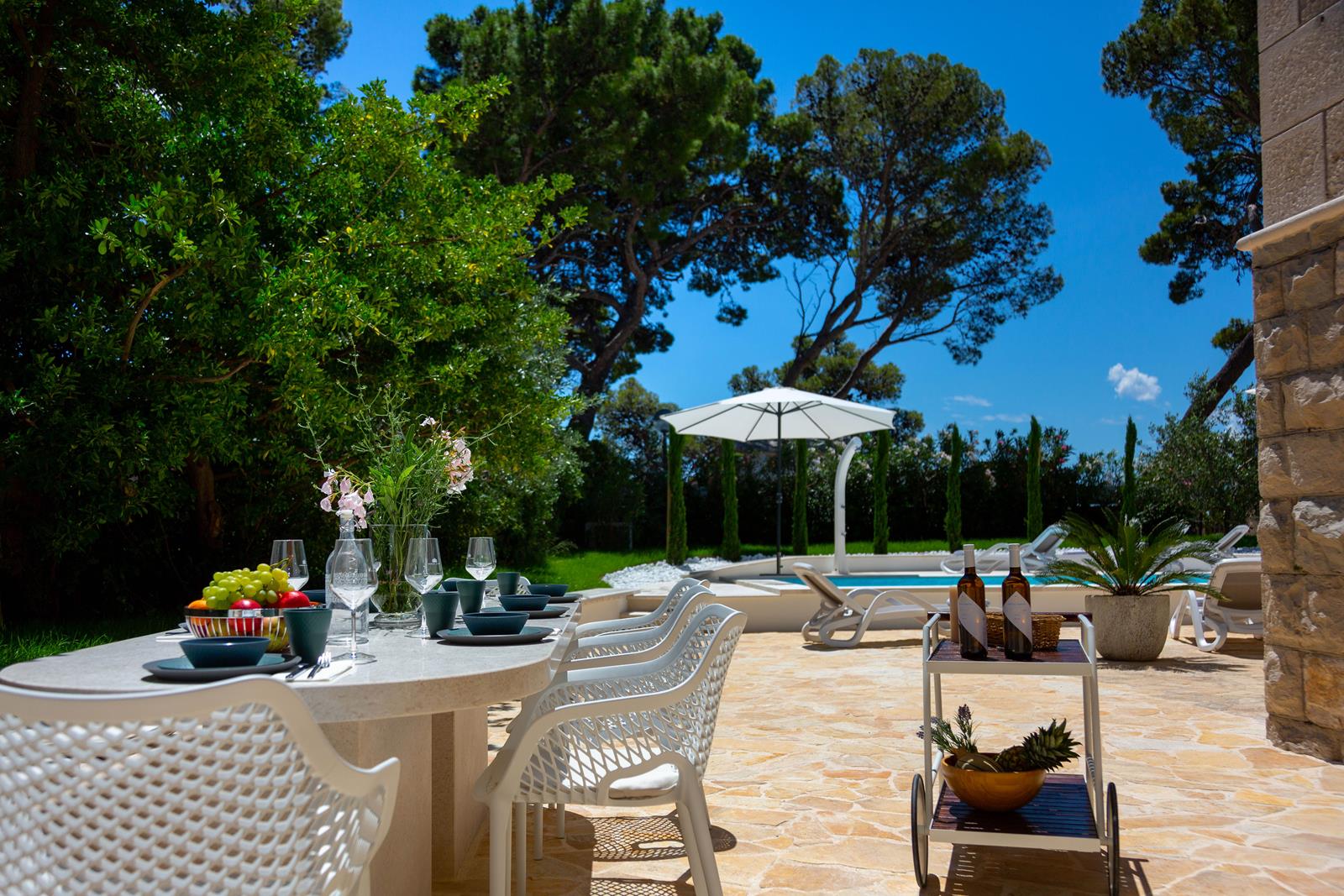 Posebna čar naše vile je prostrana okućnica s prekrasnim vrtom u kojem se miješaju mediteransko-dalmatinski mirisi lavande, kadulje i ružmarina. U vrtu smo vam pripremili ležaljke i miran kutak za sunčanje, idealan za opuštanje bez gužve i buke s plaže, a dodatni užitak pruža grijani bazen u kojem možete plivati i kad sunce nije na svom vrhuncu.